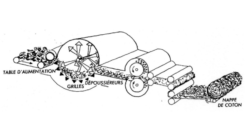 L’ouvrière dite peseuse place du coton en quantité égale par fraction du tapis roulant d’entrée, trois autres l’étalent régulièrement, puis passent sous les cylindres. Ensuite un frappeur à trois marteaux vient le battre pour l’ouvrir et aérer, et de nouveau stabilisé entre deux nouveaux cylindres, avant enroulement sur un rouleau final. Léger étirage avec les vitesses des rouleaux, de l’ordre de 33cm/m. Il est enroulé sur des rouleaux en bois en fin de processus, pour l’emmener aux cardes.